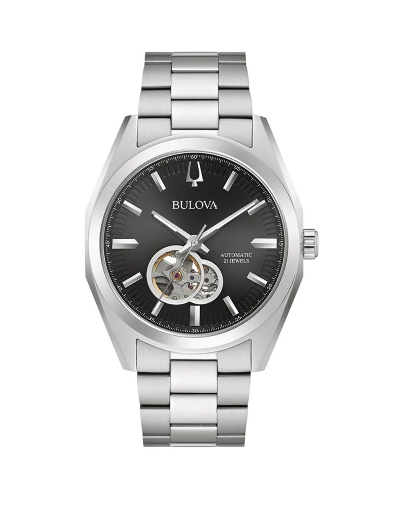42mm Bulova muški automatik sat iz kolekcije Surveyour Line, klasičnog dizajna sa kućištem i narukvicom od nerđajućeg čelika u srebrnoj boji. Brojčanik je crne boje sa otovorom kroz koji se vidi automatski mehanizam.