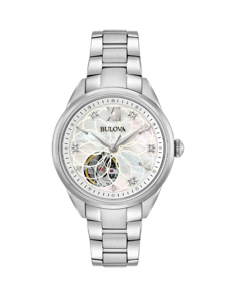 Bulova Sutton model iz ženske Classic kolekcije je novi Bulova automatik sat od nerđajućeg čelika. Sat je u srebrnoj boji, sa sedefnim brojčanikom ukrašenim sa 5 dijamanata. Staklo je safirno, a vodootpornost je 3 ATM