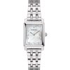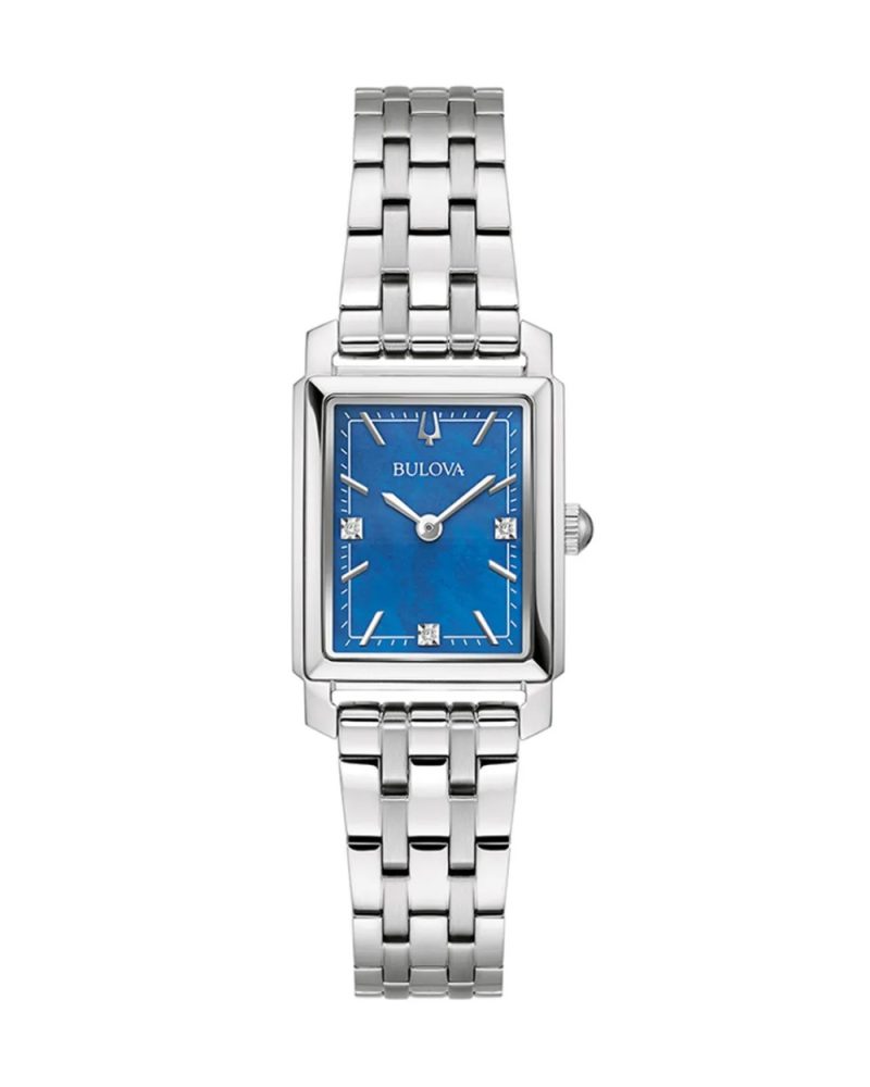 Bulova Sutton ženski kvarcni sat ima 21mm pravougaono kućište, plavi sedefni brojčanik ukrašen sa 3 diskretna dijamanta i narukvicu od nerđajućeg čelika.