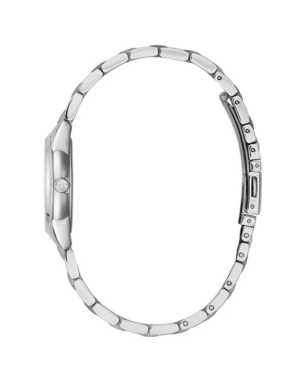 Bulova Sutton ženski kvarcni sat ima 28mm srebrno kućište, roze brojčanik ukrašen sa 11 dijamanata, safirno staklo otporno na grebanje i narukvicu od nerđajućeg čelika. Vodootpornost sata je 3 ATM.