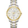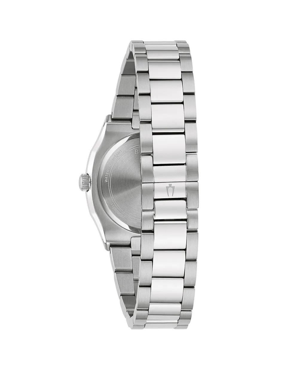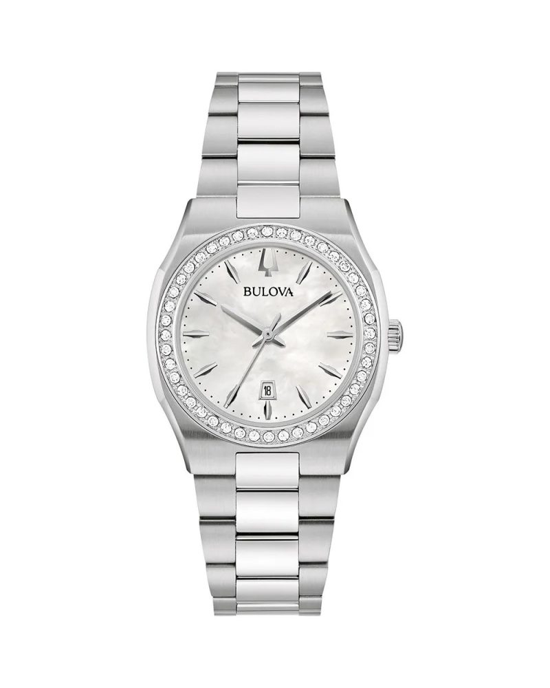 Bulova Surveyor ženski kvarcni sat ima 31mm srebrno kućište sa 22 ručno postavljena dijamanta, beli sedefni brojčanik sa prikazom datuma, mineralno staklo i narukvicu od nerđajućeg čelika.