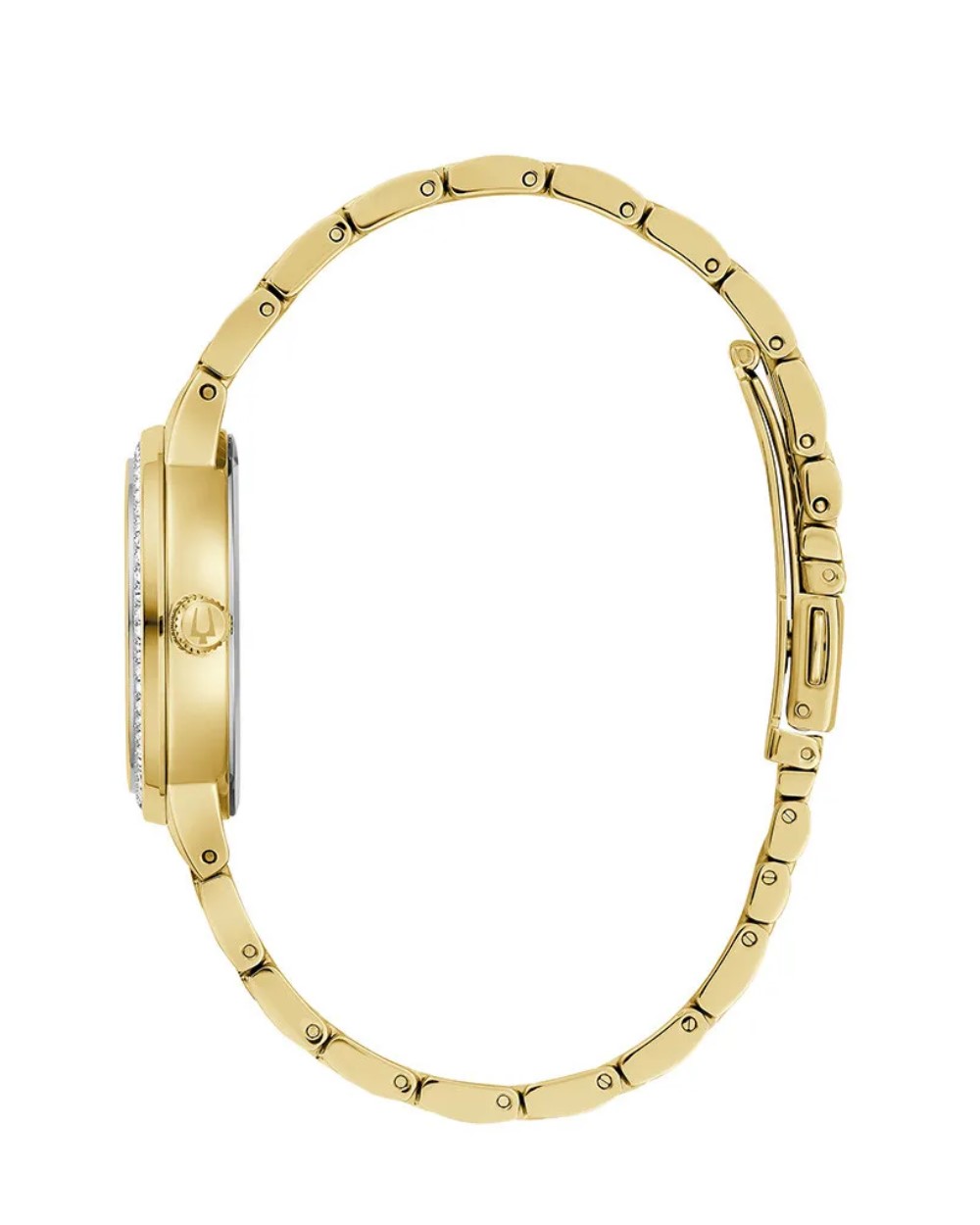 Bulova Crystal Phantom ženski kvarcni sat ima 32mm zlatno kućište i narukvicu od nerđajućeg čelika ukrašenu sa 112 kristala, brojčanik boje zlata sa 8 kristala i mineralno staklo.