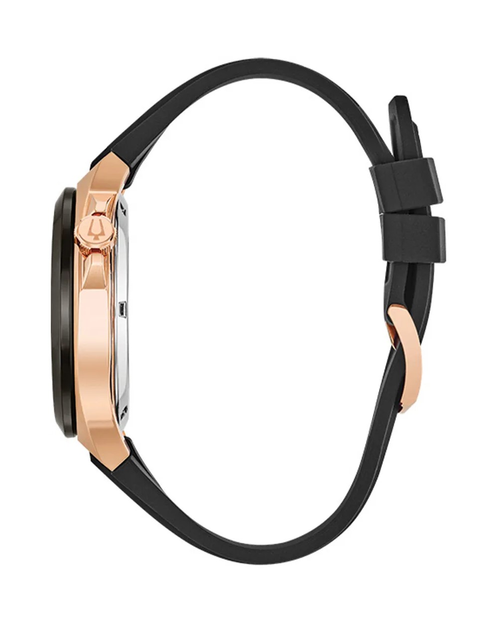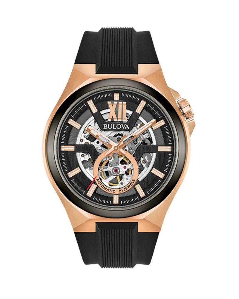 Maquina 46mm Bulova Classic Automatic je novi sportski sat sa kućištem od nerđajućeg čelika u kombinaciji boje roze zlata i sive, crni brojčanik je otvoren i otkriva mehanizam, i poklopac sata je transparentan. Mehanizam je skeleton automatik sa 40 sati autonomije rada. Staklo je safirno, narukvica je od mat crnog silikona. Vodootpornost je 10 ATM