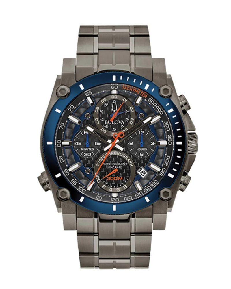 46mm Bulova Precisionist pokreće Bulovin Precisionist kvarcni hronograf mehanizam sa 262kHz frekvencijom vibracije – što daje osam puta veću preciznost od standardnog sata. Kućište od nerđajućeg čelika tamno sive boje sa šrafljenom krunicom, tamno sivi hronograf brojčanik sa belim detaljima i prikazom datuma, zakrivljeno mineralno staklo otporno na ogrebotine, narukvica tamno sive boje od nerđajućeg čelika i vodootpornost do 30 ATM samo su neke od karakteristika ovog modela.