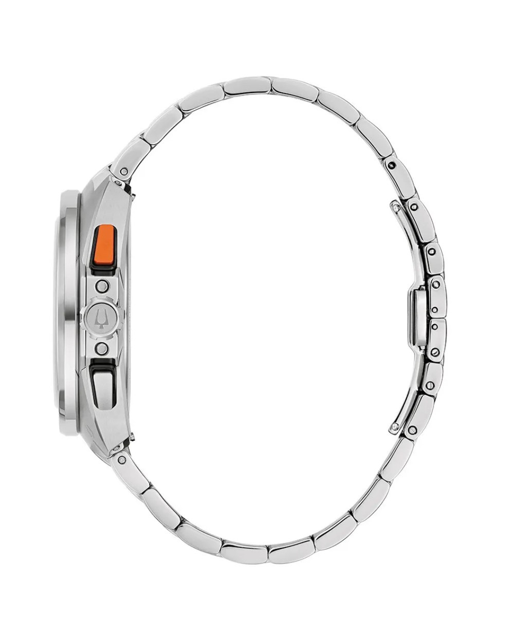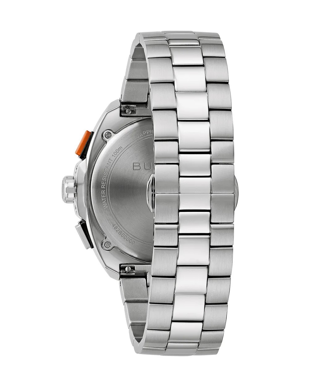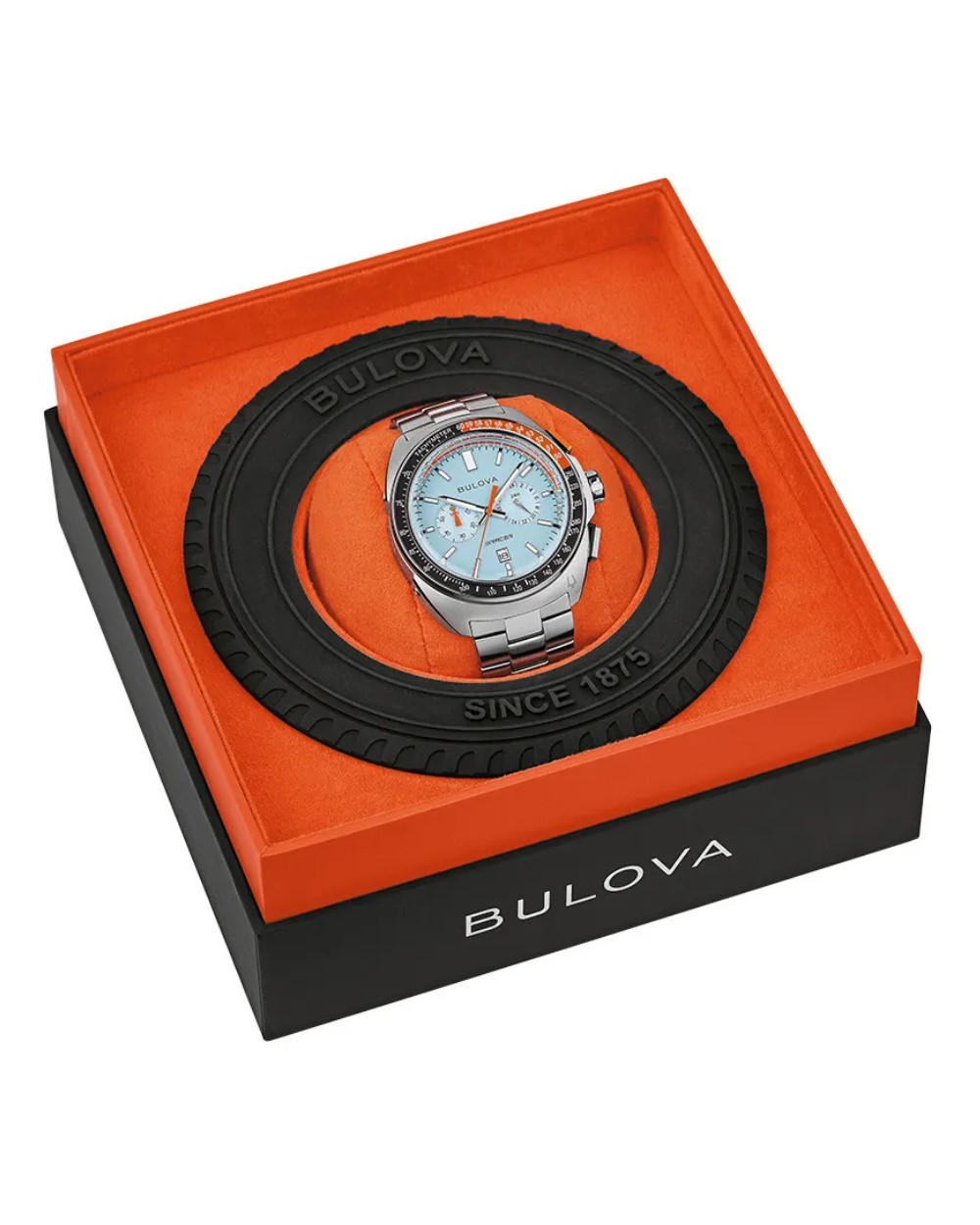 Bulova Racer muški hronograf ima 42mm kućište od nerđajućeg čelika, svetlo plavi brojčanik sa narandžastim detaljima i prikazom datuma, safirno staklo otporno na grebanje i narukvicu od nerđajućeg čelika. Vodootpornost sata je 10 ATM