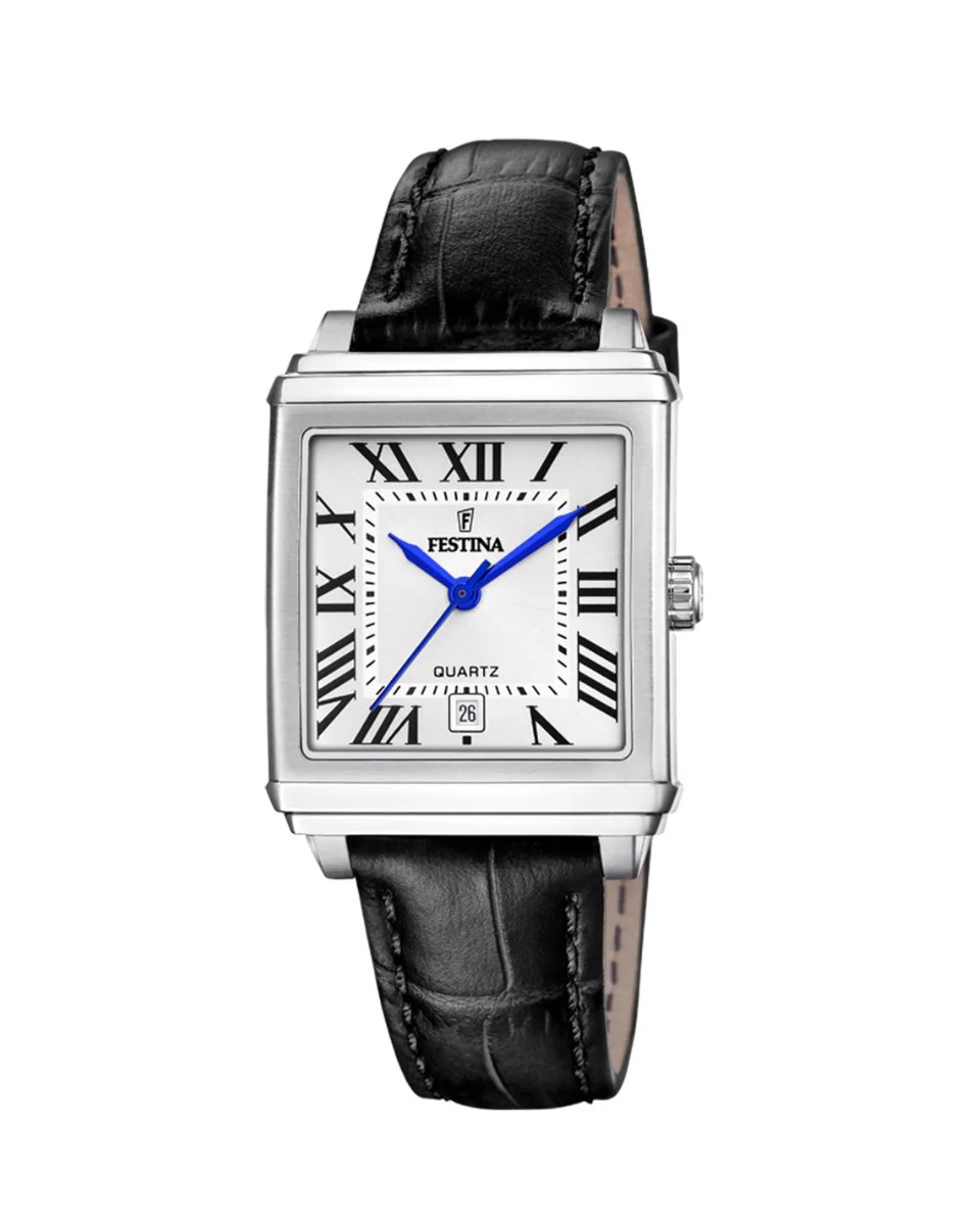 Festina ženski kvarcni sat ima 33mm četvrtasto kućište, srebrni brojčanik sa prikazom datuma, rimskim brojevima i plavim kazaljkama, mineralno staklo i narukvicu od nerđajućeg čelika. Vodootpornost sata je 5 ATM