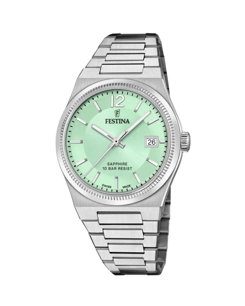 Festina Swiss Made ženski kvarcni sat ima 35mm čelično kućište, svetlo zeleni brojčanik sa prikazom datuma, safirno staklo otporno na grebanje i narukvicu od nerđajućeg čelika. Vodootpornost je 10 ATM