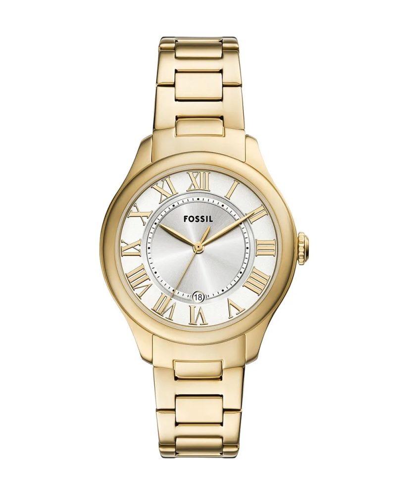 Fossil Harlow ženski kvarcni sat ima 27mm četvrtasto kućište boje zlata, bež brojčanik sa crnim rimskim brojevima, mineralno staklo i narukvicu od nerđajućeg čelika. Vodootpornost sata je 3 ATM