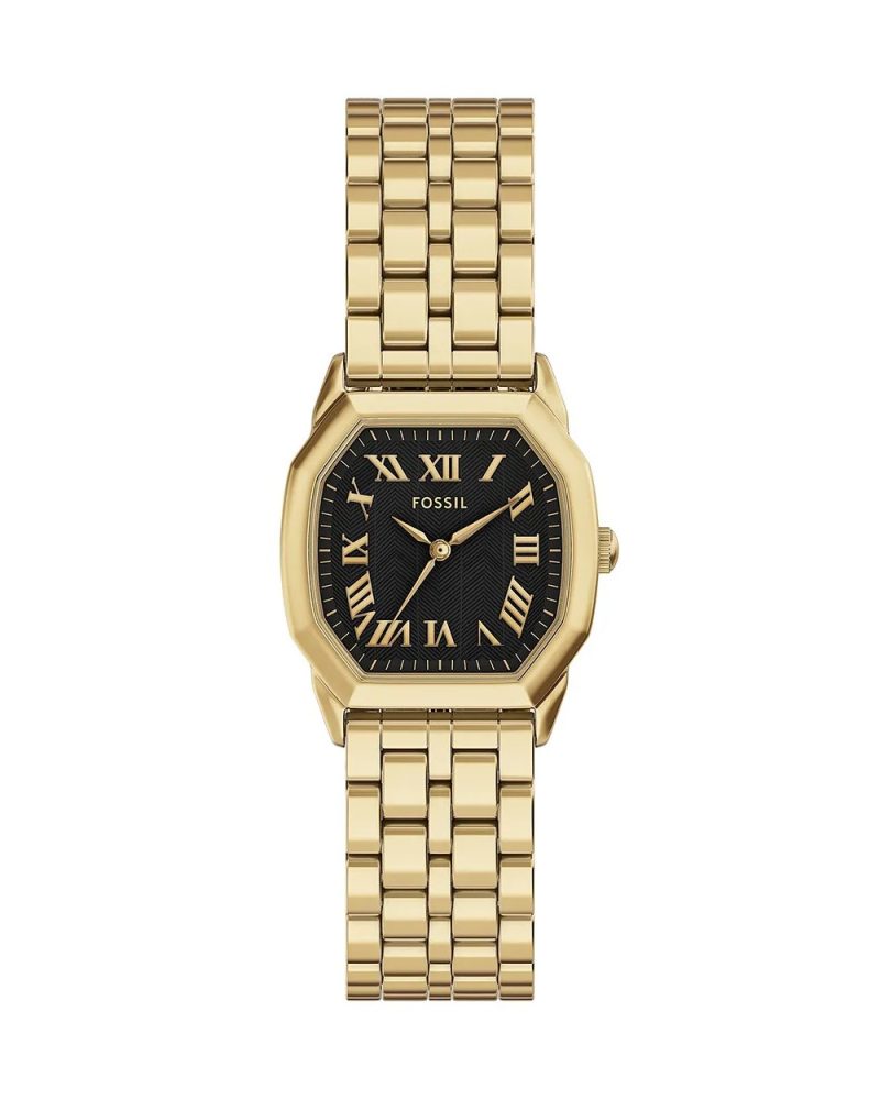 Fossil Harlow ženski kvarcni sat ima 27mm četvrtasto kućište boje zlata, bež brojčanik sa crnim rimskim brojevima, mineralno staklo i narukvicu od nerđajućeg čelika. Vodootpornost sata je 3 ATM