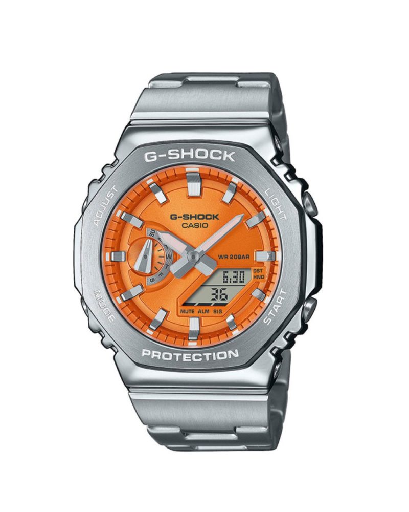 Svaki sat GM-2110D ima osmougaonu masku kućišta, iskovanu od nerđajućeg čelika i poliranu do završne obrade poput ogledala. Ovaj robustan, ali prefinjen dizajn je dopunjen kućištem od fine smole ojačane staklenim vlaknima, čime se postiže tanak profil od samo 11,8 mm — što ga čini najtanjim G-SHOCK-om u analogno-digitalnoj liniji.