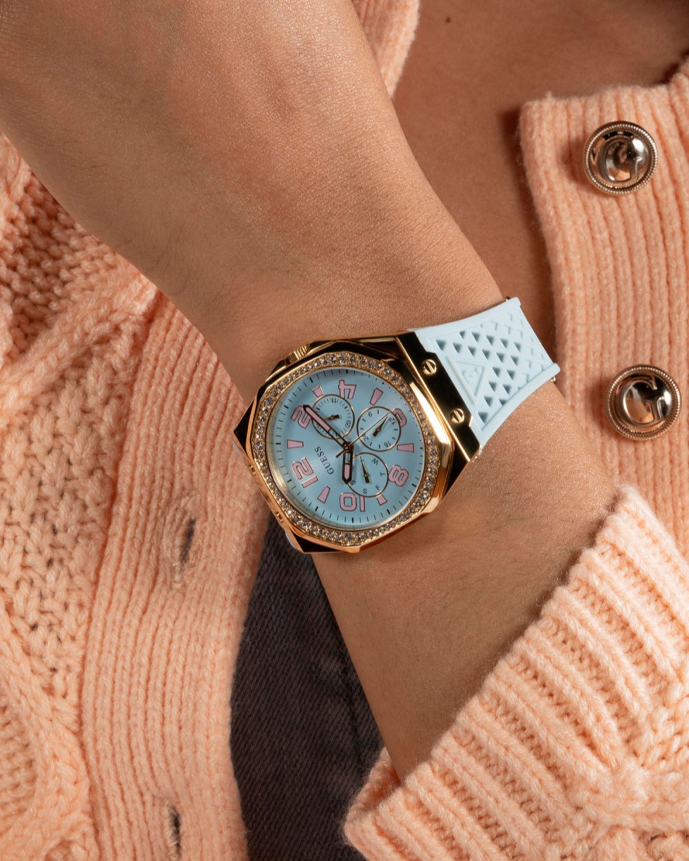 Moderna verzija sportskog sata Guess oktagonalnog oblika kućišta u boji roze zlata sa cirkonima. Teget silikonska narukvica sa prorezima u obliku trougla.