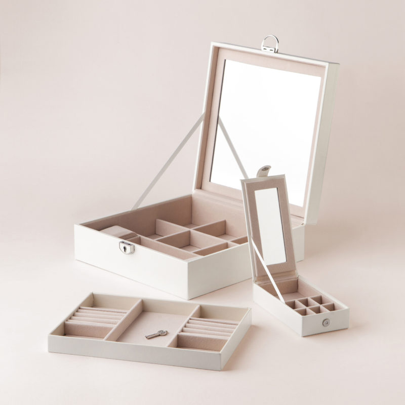 Kutija za nakit sa prenosnim delom, odnosno manjom kutijom u sebi, koja se može izvaditi i koristiti kao zasebna kutija. Posebno je praktična za putovanja. Velika kutija se zatvara, tj. otvara uz pomoć kopče u srebrnoj boji, a manja uz pomoć drikera srebrne boje koji je na kratkom kaišiću. Sa donje strane poklopca velike kutije celom površinom se prostire ogledalo. Dno kutije je rezervisano za krupniji nakit i satove, a poklapa ga okvir sa malom putnom kutijom i mnoštvom pregrada za sitan nakit. Putna kutija takođe ima malo ogledalo ispod poklopca. Unutrašnjost obeju kutija obložena je mekim materijalom svetle boje, koji sprečava oštećenja nakita. Kutija je dostupna u svetlo bež i crnoj boji.