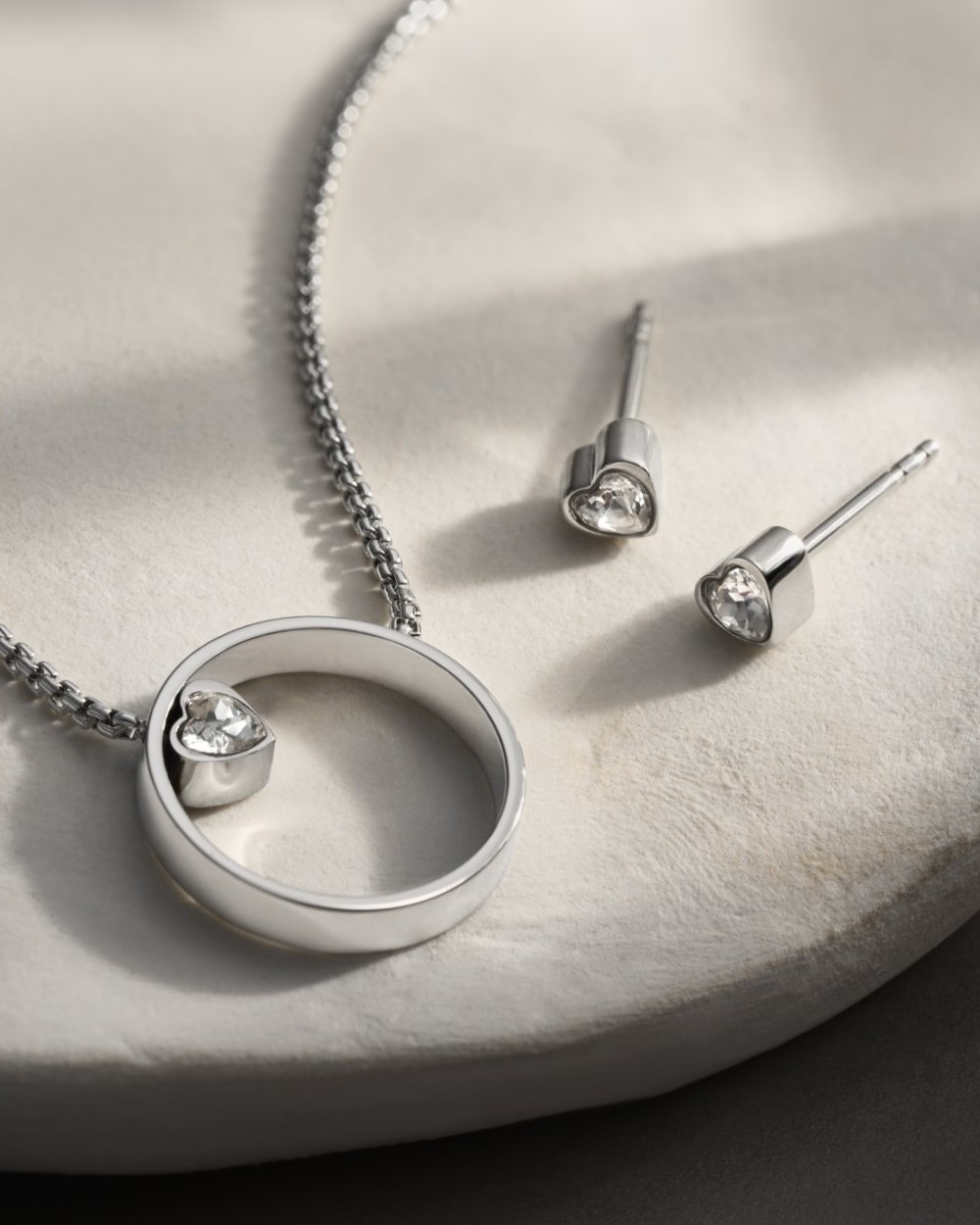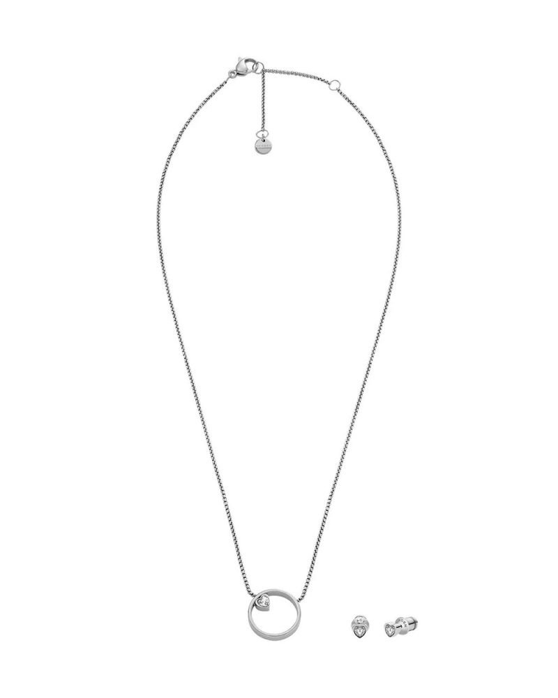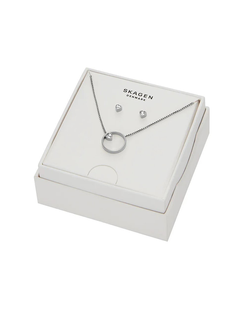 Skagen ženski poklon set. Ogrlica i minđuše u boji srebra.